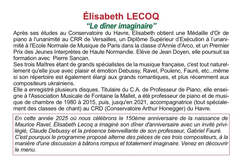 "Le dîner imaginaire" avec Élisabeth Lecoq, pianiste.