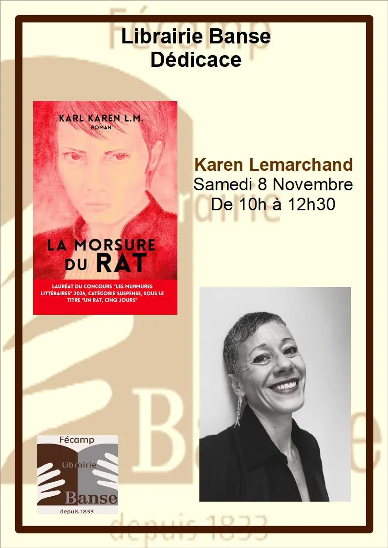 Karen Lemarchand sera présente à la librairie, le samedi 8 Novembre de 10h à 12h30 pour dédicacer son roman : La morsure du rat.
