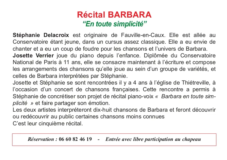 RÉCITAL BARBARA avec Stéphanie Delacroix, chanteuse et Josette Verrier, pianiste.